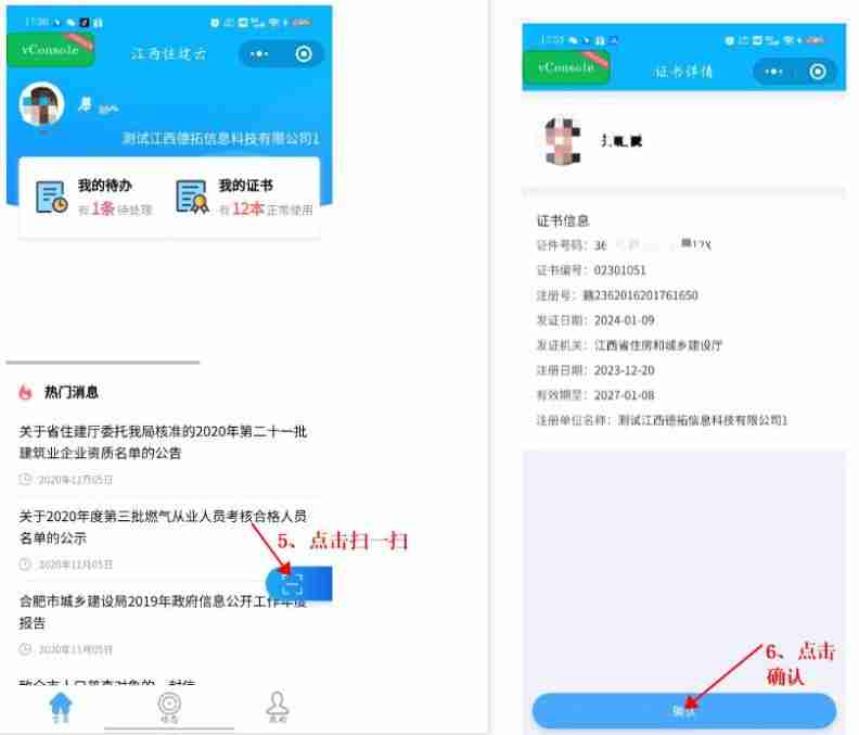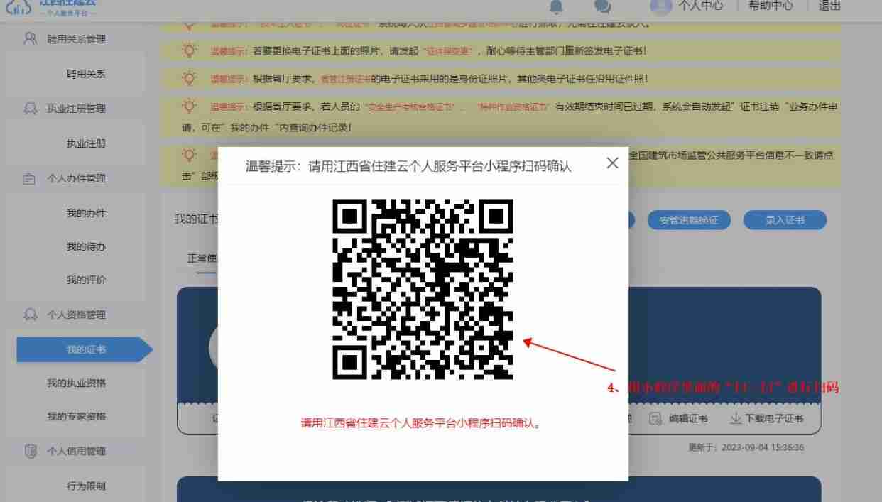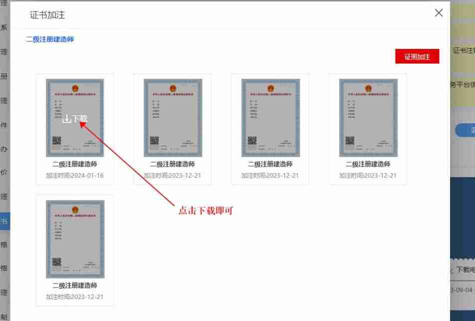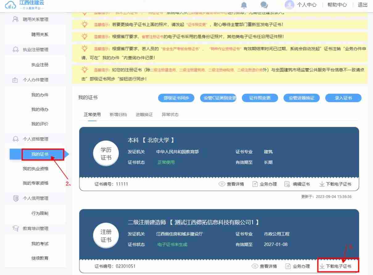 人員登錄【江西住建云】個人服務(wù)平臺,在【我的證書】模塊內(nèi),找到二級注冊建造師電子證書。下載證書的操作流程如:點擊【下載電子證書】按鈕,通過微信小程序掃碼認證后,點擊【證書加注】。待證書加注成功后,即可下載電子證書。