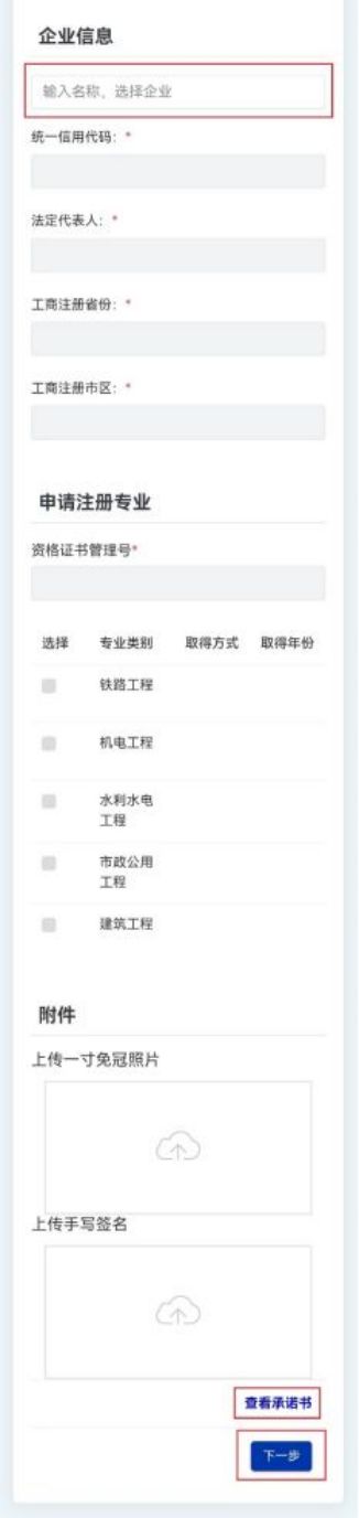 第二步:在“聘用企業(yè)信息”欄目中的企業(yè)名稱輸入框中輸入所受聘企業(yè)的名稱關(guān)鍵字(圖9-2),在該輸入框下會提示可選的企業(yè),點(diǎn)擊所受聘的企業(yè)名稱,系統(tǒng)自動提取該企業(yè)的統(tǒng)一信用代碼、法定代表人、工商注冊省份、工商注冊市區(qū);(注:若輸入框下未提示聘用企業(yè)的名稱或系統(tǒng)未提取出該企業(yè)的信息,說明企業(yè)名稱輸入錯誤或該企業(yè)還未在“建設(shè)行業(yè)執(zhí)業(yè)資格管理信息系統(tǒng)”(點(diǎn)擊進(jìn)入)完成注冊和實名認(rèn)證)