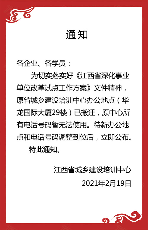 為切實(shí)落實(shí)好《江西省深化事業(yè)單位改革試點(diǎn)工作方案》文件精神,原省城鄉(xiāng)建設(shè)培訓(xùn)中心辦公地點(diǎn)(華龍國際大廈29樓)已搬遷,原中心所有電話號(hào)碼暫無法使用。待新辦公地點(diǎn)和電話號(hào)碼調(diào)整到位后,立即公布。