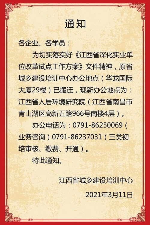 為切實落實好《江西省深化實業(yè)單位改革試點工作方案》文件精神,原省城鄉(xiāng)建設培訓中心辦公地點(華龍國際大廈29樓)已搬遷,現(xiàn)新辦公地點為:江西省人居環(huán)境研究院(江西省南昌市青山湖區(qū)高新五路966號南樓4層)。