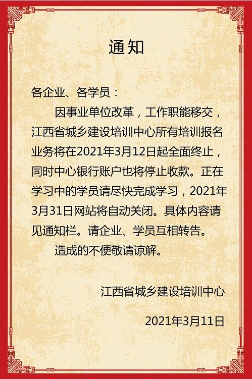 因事業(yè)單位改革,工作職能移交,江西省城鄉(xiāng)建設培訓中心所有培訓報名業(yè)務將在2021年3月12日起全面終止,同時中心銀行賬戶也將停止收款。正在學習中的學員請盡快完成學習,2021年3月31日網(wǎng)站將自動關閉。具體內(nèi)容請見通知欄。請企業(yè)、學員互相轉告。