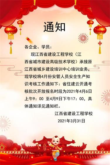 現(xiàn)江西省建設工程學校(江西省城市建設高級技術學校)承接原江西省城鄉(xiāng)建設培訓中心培訓業(yè)務,現(xiàn)學校將4月份安管人員安全生產(chǎn)知識考核工作通知下:省住建云開通考核批次開放報名時段為2021年4月6日上午9:00至4月9日下午17:00,具體通知詳見通知欄。