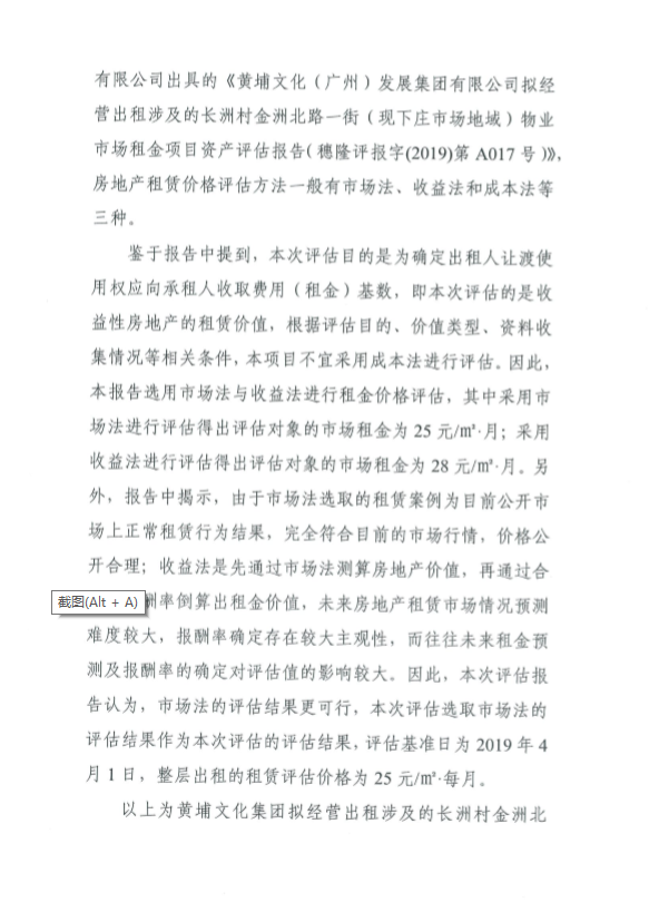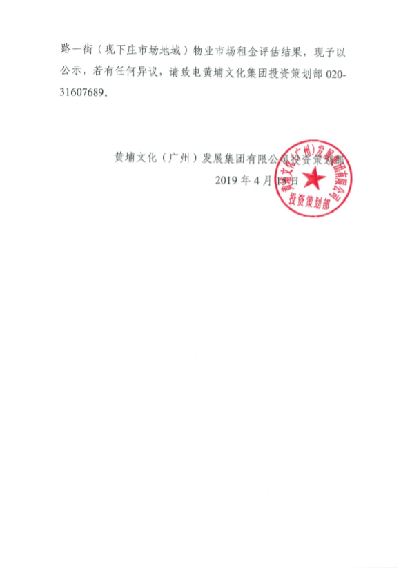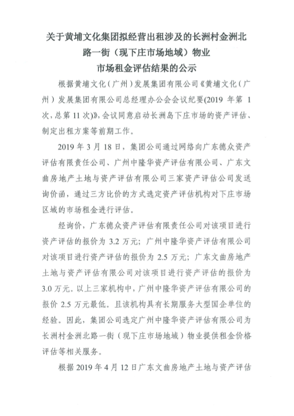 公示:關(guān)于黃埔文化集團(tuán)擬經(jīng)營(yíng)出租涉及的長(zhǎng)洲村金洲北路一街(現(xiàn)下莊市場(chǎng)地域)物業(yè)市場(chǎng)租金評(píng)估結(jié)果的公示